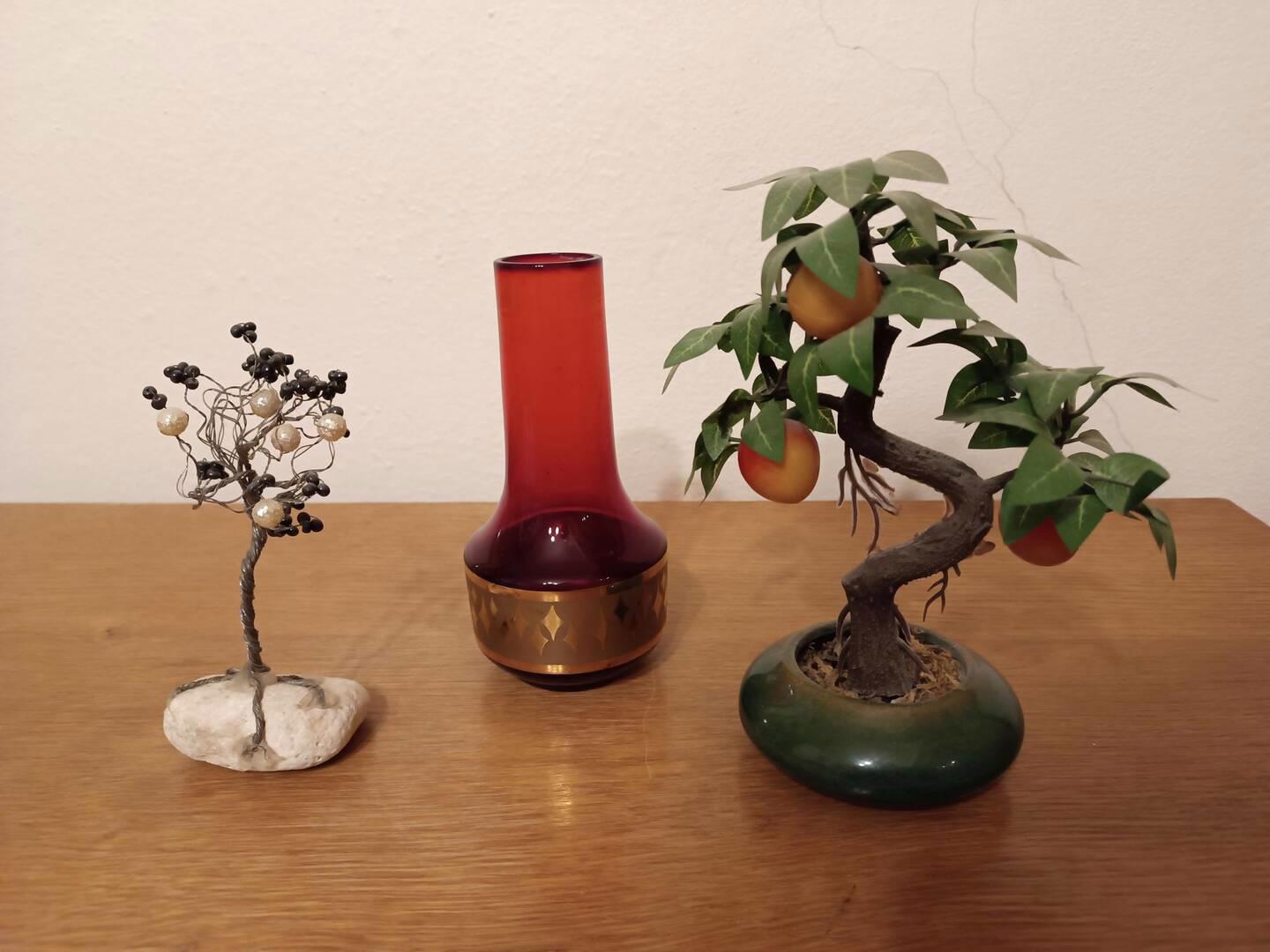 Prodám dva stromečky (kovový – výška: 15 cm, zelený s ovocem – výška: 19,5 cm) a červenou skleněnou vázu (výška: 16 cm, průměr: 7,5 cm). Cena za vše.