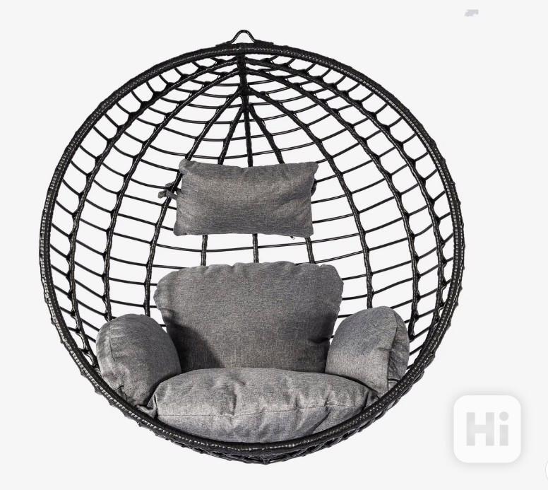 černé křeslo, rozbaleno, kovové plastové křeslo, umělý rattan, v ceně jsou postry, v ceně není závěsné lano, křeslo je určené k zavěsení na provaz, skladem 2kusy, cena kus 1.990Kč