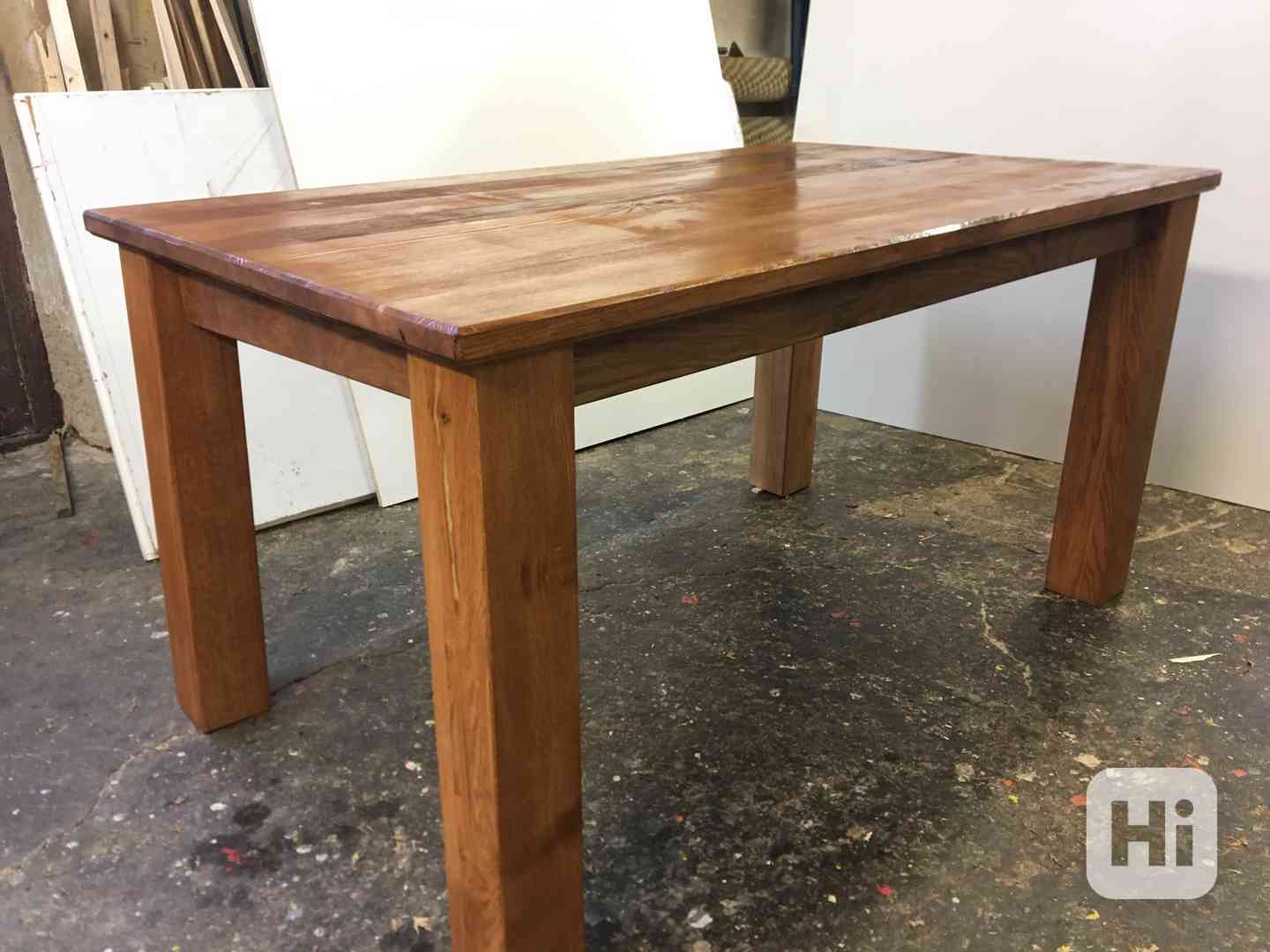 Prodám masivní, těžký, jídelní dubový stůl o rozměrech 150x90 cm deska a výška stolu je 78,5 cm. Stůl je namořený a nalakovaný. Nohy mají průřez 11x11 cm. Deska má tloušťku 3,5 Cm, stůl je namořen a nalakován.