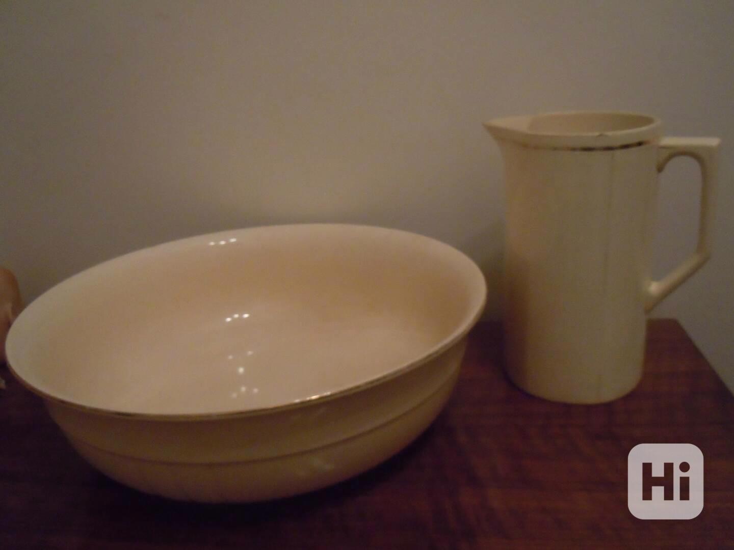 Prodám krásnou keramickou soupravu do starožitné koupelny zn. Villeroy and Boch, Mettlach, Made in Saar-Basin, sestávající z keramické velké mísy (lavoru) a džbánu, barva slonová kost. Rozměry mísy: průměr 44 cm, výška 14 cm., Rozměry džbánu: průměr 14,5 cm, výška 24 cm. Na míse je jeden oťuk a vlásečnicové prasklinky, na džbánu 2 nepatrné oťuky - viz foto (Zohledněno v ceně). Osobní předání na Praze 3, nebo zaslání přes Balíkovnu. Volejte 770 630 523, nebo pište na morgiana007@gmail.com
