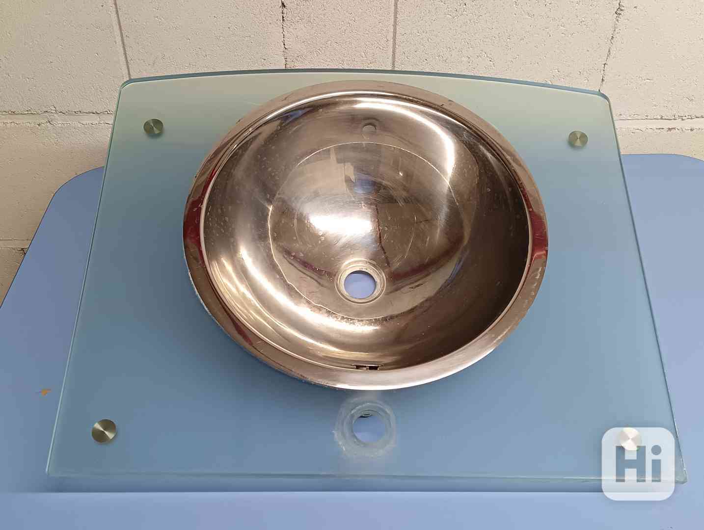 Prosím viz foto... zespodu matové tvrzené sklo se zabroušenými hranami, plechové umyvadlo. K dispozici jsou případně celkem 3 kusy, cena je uvedena za jeden komplet. Rozměr skla je : šířka 65cm, hloubka 55cm, otvor pro připojení 35mm. Síla skla je 15mm. Průměr umyvadla je 44cm.